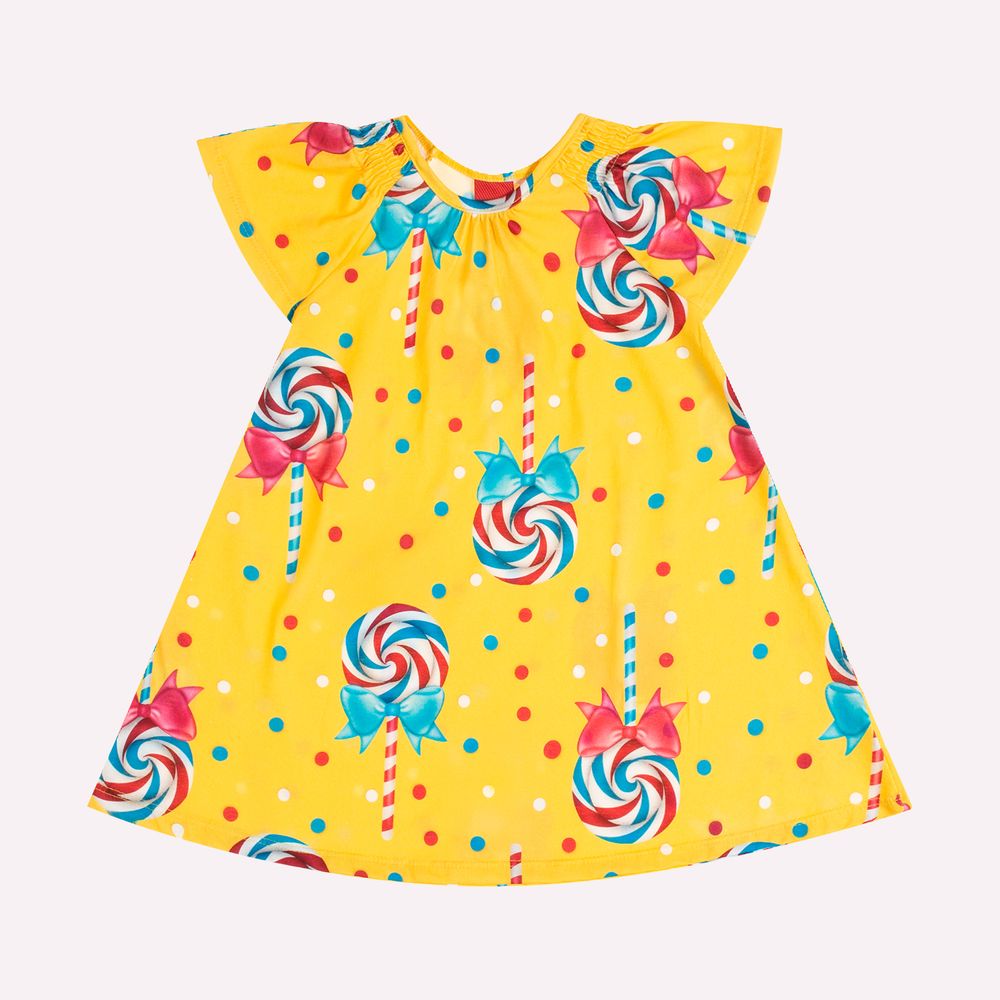 A estampa é um espetáculo à parte, com pirulitos, laços e bolinhas coloridas, que transforma o vestido em um universo doce e divertido. Esse vestido é ideal para deixar cada momento mais leve e cheio de cor, perfeito para passeios, festinhas e dias de sol.