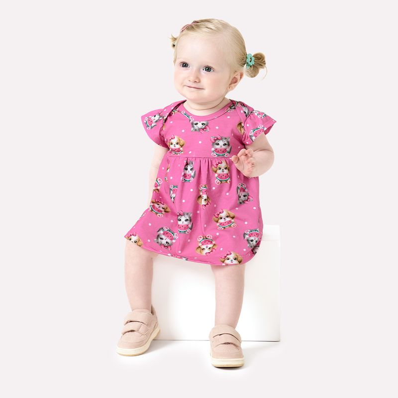 A modelagem conta com recorte franzido na cintura, criando um caimento soltinho e gracioso, perfeito para valorizar o visual infantil. As mangas com babadinhos delicados acrescentam um toque romântico, enquanto a abertura entrepernas com botões de pressão garante praticidade na troca. A estampa exclusiva é um verdadeiro show de ternura, com cachorrinhos e gatinhos com detalhes de melancia, distribuídos em meio a poás, criando um visual alegre e lúdico que encanta à primeira vista.