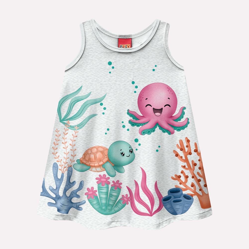 A modelagem soltinha e fluida proporciona liberdade de movimento, enquanto o decote redondo e as cavas confortáveis mantêm o visual moderno e fresquinho. A estampa vibrante com polvo, tartaruga, algas e corais coloridos cria uma atmosfera lúdica e divertida, transformando o look em uma verdadeira viagem ao fundo do mar. Um vestido irresistível, cheio de personalidade e perfeito para acompanhar momentos de alegria e descobertas!