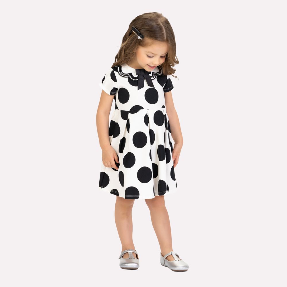O corpo do vestido é valorizado pela clássica estampa de bolinhas póa, um ícone atemporal que nunca sai de moda. A cintura marcada com pregas garante caimento estruturado e volume suave à saia. Com design versátil e elegante, esse vestido é perfeito tanto para ocasiões especiais quanto para passeios em família, garantindo que sua pequena esteja sempre confortável e cheia de estilo. Uma peça delicada, divertida e atemporal para brilhar em todas as estações