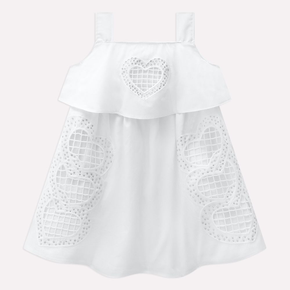 A modelagem traz alças largas e confortáveis, decote reto e recorte franzido na cintura, proporcionando caimento soltinho e fluido. Já a saia ganha ainda mais charme com os corações bordados em destaque, que se repetem harmoniosamente, criando um visual único e cheio de personalidade. Uma peça que une conforto, elegância e o brilho especial que toda menina merece para celebrar momentos inesquecíveis.