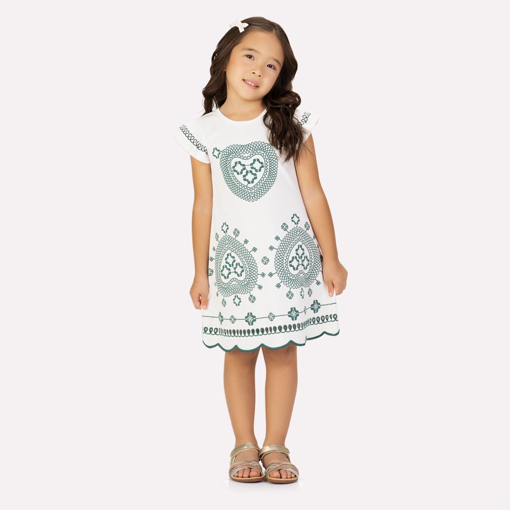 A peça se destaca pela estampa localizada de corações e formas geométricas, criando um visual único e sofisticado, enquanto o corte a laser na barra acrescenta um toque artesanal e refinado. As mangas com babadinhos completam o visual com um ar romântico e angelical. Perfeito para ocasiões especiais ou passeios em família, esse vestido é um verdadeiro mimo, elegante, confortável e com o charme irresistível da Milon!
