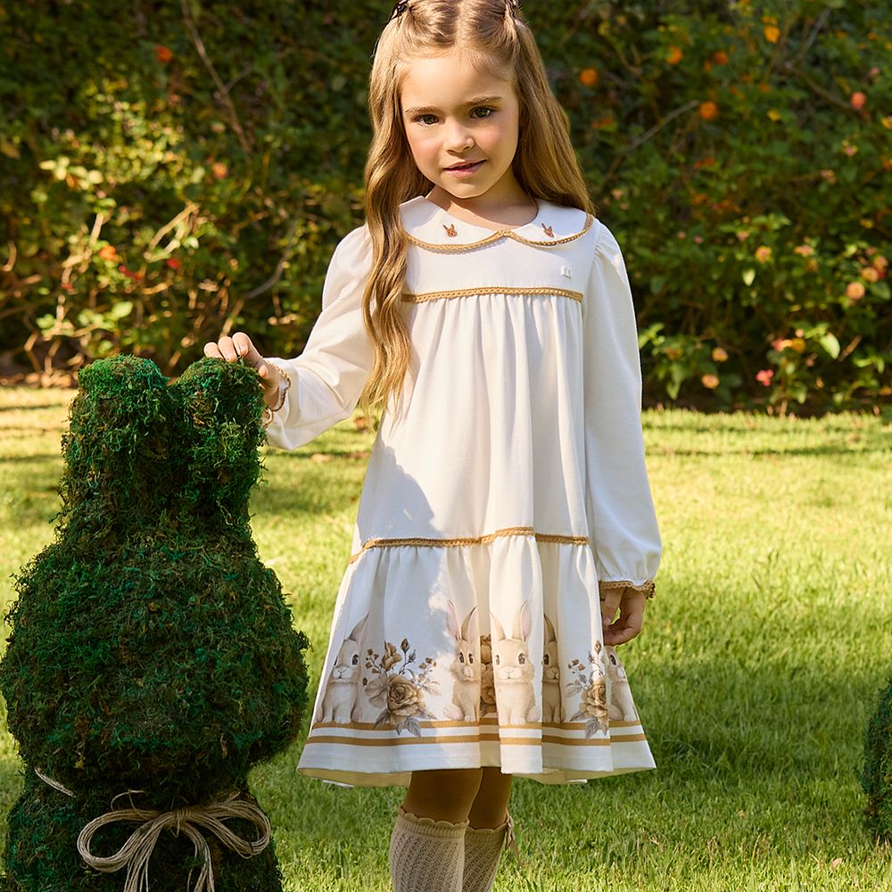 O destaque da peça fica por conta da estampa localizada com coelhinhos e elementos inspirados na natureza, criando uma composição charmosa e delicada na barra do vestido. A gola clássica recebe bordado refinado com aplicação termocolante, acrescentando um detalhe elegante e cuidadosamente trabalhado ao design. As mangas longas levemente franzidas completam o visual com suavidade e um acabamento encantador. Ideal para passeios, encontros em família e ocasiões especiais, especialmente em momentos temáticos como a Páscoa, este vestido infantil menina Milon une conforto, delicadeza e acabamento sofisticado em uma peça cheia de charme.