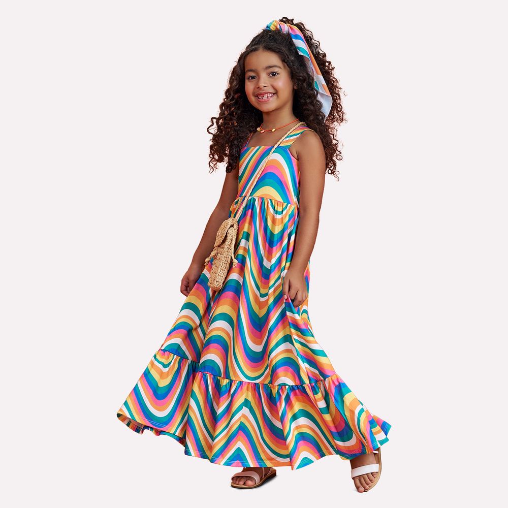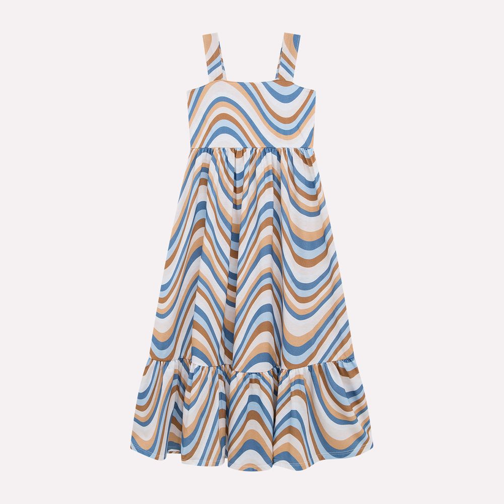 O grande destaque é a estampa de ondas, que mistura tons vibrantes em harmonia, trazendo uma atmosfera alegre e moderna ao look. Uma peça que combina sofisticação e descontração, ideal para passeios, festas ou momentos especiais que pedem um visual cheio de vida. Um vestido que traduz o espírito leve da infância, divertido, confortável e encantador em cada detalhe!
