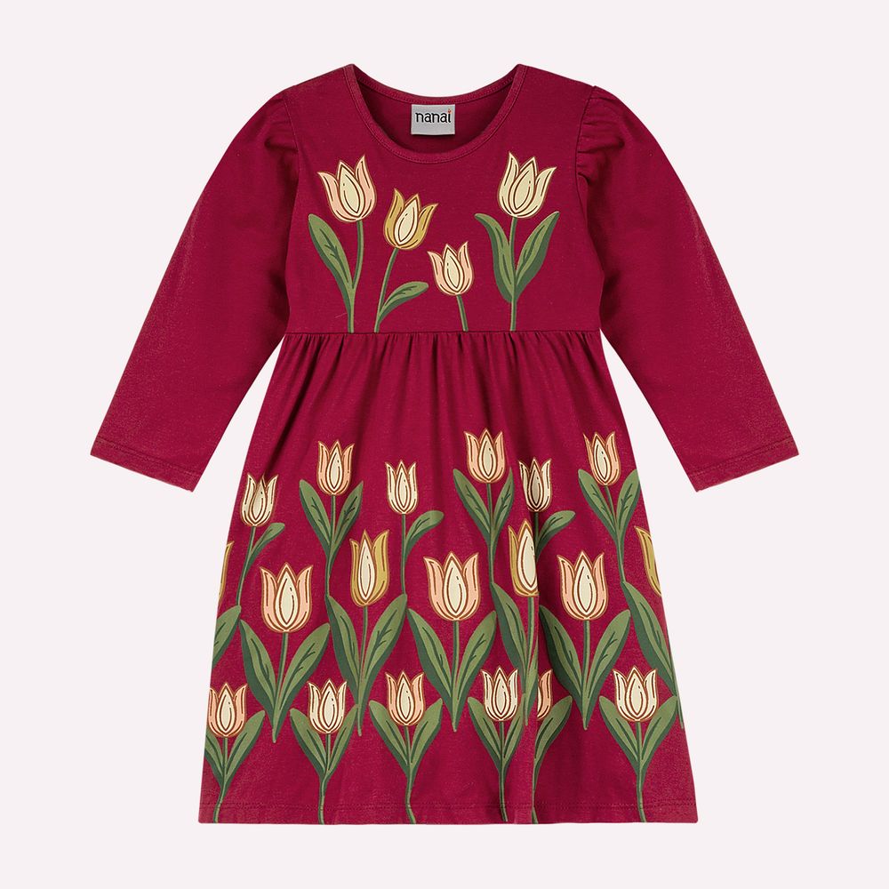 O vestido infantil menina Nanai floresce em delicadeza, trazendo a beleza das tulipas em uma composição harmoniosa e sofisticada que envolve a infância com cor e leveza.