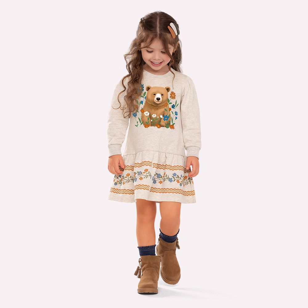 Confeccionado em moletinho 100% algodão, o tecido oferece toque macio, caimento leve e excelente conforto térmico, ideal para meia-estação e dias amenos. A estrutura do moletinho garante suavidade ao vestir, mantendo a respirabilidade e proporcionando liberdade de movimentos para a menina brincar ou passear com total bem-estar. A modelagem evasê é valorizada por recorte na altura da cintura, que cria leve franzido e amplia a saia com fluidez. O destaque frontal traz estampa localizada de ursinho envolto por flores, enriquecida com aplicação de strass que adiciona brilho sutil e sofisticado à composição. Na parte inferior, a barra recebe babado estruturado com estampa complementar em padronagem inspirada na natureza, criando movimento gracioso e acabamento diferenciado.