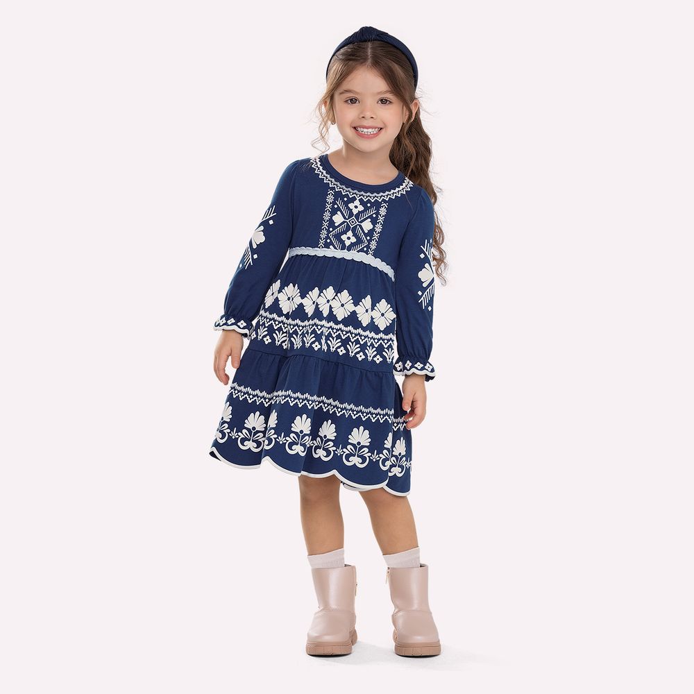 As mangas longas complementam o visual com romantismo sutil, finalizadas com punhos ajustados que garantem conforto e melhor encaixe. O decote arredondado mantém a praticidade no vestir, preservando a elegância do design. A estampa ornamental em contraste agrega personalidade e requinte, tornando este vestido infantil ideal para festas, aniversários e momentos especiais. A Nanai apresenta uma peça que une qualidade do algodão, modelagem pensada para o caimento perfeito e detalhes diferenciados como o corte a laser, resultando em um vestido infantil menina sofisticado, confortável e cheio de charme.