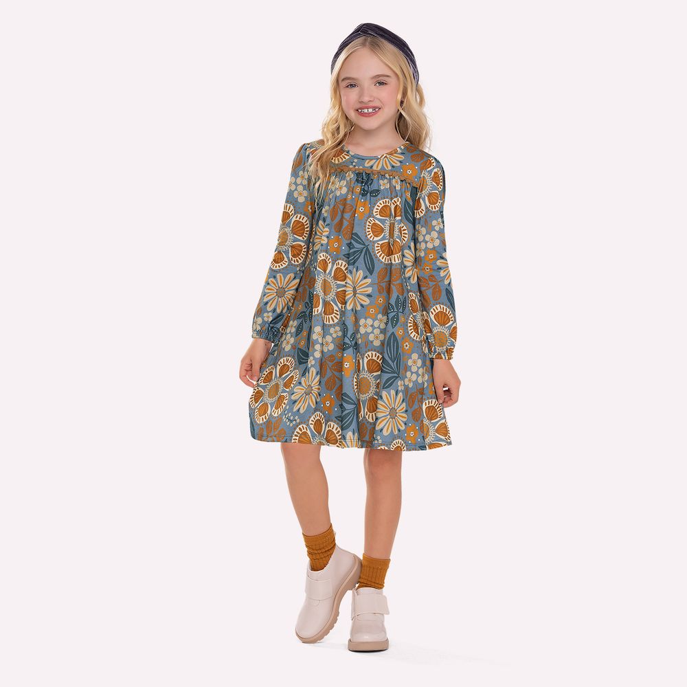 A estampa rotativa com flores e folhas distribui-se harmoniosamente por toda a peça, criando um visual vibrante e sofisticado. O aviamento aplicado na região do recorte frontal adiciona um acabamento refinado, destacando o cuidado nos detalhes e elevando o padrão estético do modelo. As mangas longas completam a proposta casual com elegância, tornando o vestido versátil para diferentes ocasiões. A barra levemente arredondada contribui para o movimento da peça, reforçando a delicadeza da modelagem. Um vestido que traduz o cuidado da Nanai na escolha dos materiais e na construção de cada detalhe, pensado para vestir a infância com conforto, estilo e suavidade. Uma peça encantadora para iluminar momentos especiais com leveza e charme.