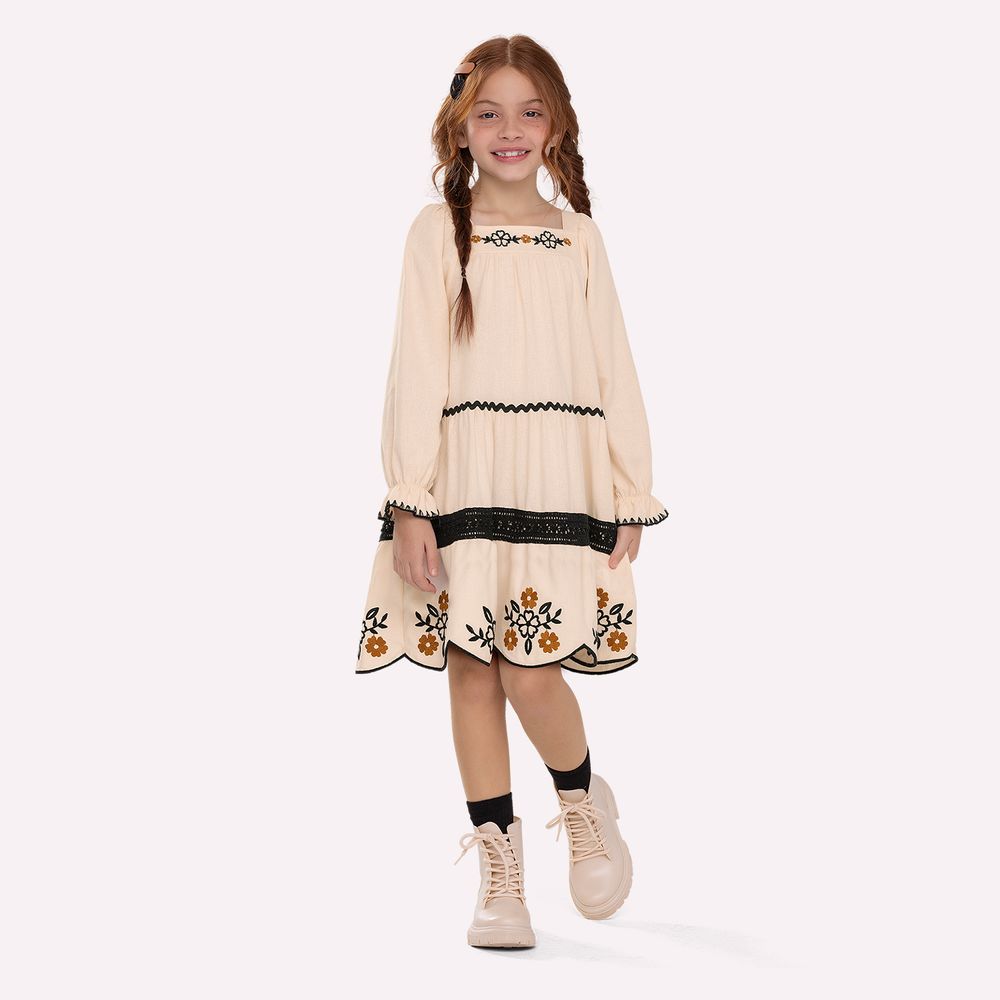 Um sopro de delicadeza que transforma qualquer ocasião em um momento especial. O vestido infantil menina Nanai é a perfeita tradução de elegância suave, com acabamento refinado e detalhes que encantam à primeira vista. Confeccionado em tecido com composição, 42% algodão, 38% viscose, 14% modal e 6% linho, a peça apresenta textura levemente estruturada, toque macio e caimento impecável. A modelagem ampla com recortes horizontais cria um efeito levemente evasê, valorizando o movimento com fluidez e sofisticação. O recorte superior recebe delicado bordado de flores, aplicado com precisão e riqueza de detalhes, destacando o cuidado artesanal da peça. Entre os recortes, aviamentos rendados e acabamentos trabalhados reforçam a estética romântica e elegante.