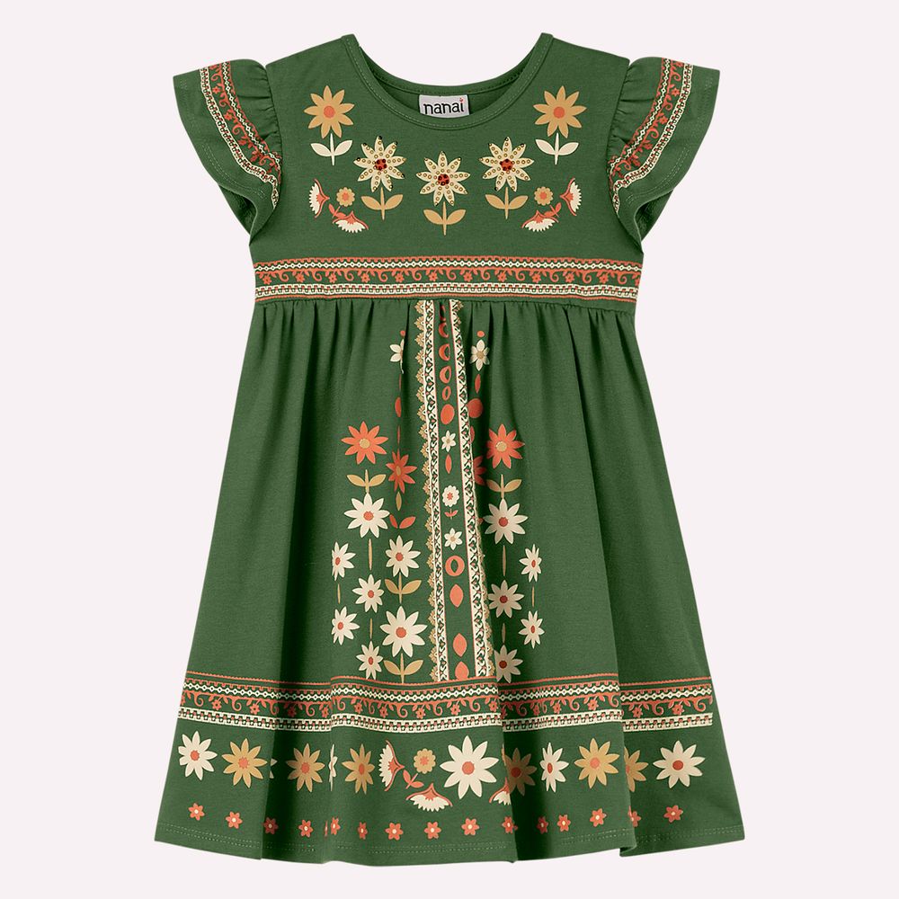 A estampa localizada de flores se destaca de forma harmoniosa na frente e na barra da peça, trazendo um visual refinado e equilibrado. Os detalhes em strass aplicados com sutileza adicionam um toque de brilho delicado, elevando o vestido com sofisticação sem perder a suavidade. As mangas com leve franzido completam o design com charme e feminilidade, enquanto o acabamento cuidadoso evidencia a qualidade da confecção Nanai. Uma peça especial que combina beleza, conforto e detalhes encantadores, perfeita para ocasiões que pedem um visual delicado e cheio de estilo.