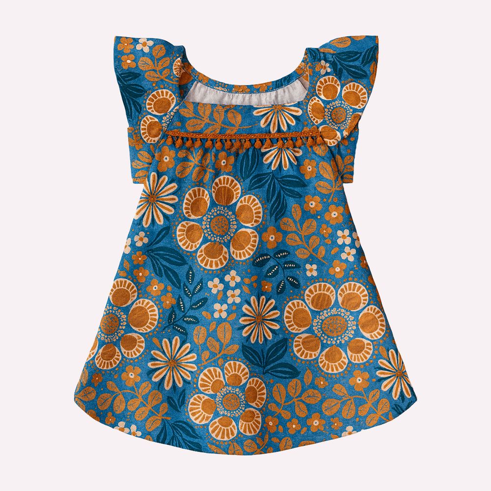 A estampa rotativa de flores se distribui de forma harmoniosa por toda a peça, criando um visual alegre e delicado. Os aviamentos aplicados complementam o design com sutileza, valorizando os acabamentos e reforçando o cuidado nos detalhes. As mangas com leve volume adicionam um toque gracioso, enquanto a barra com movimento suave finaliza o look com equilíbrio. Uma peça pensada para unir conforto, delicadeza e beleza, ideal para compor looks infantis cheios de encanto e leveza.