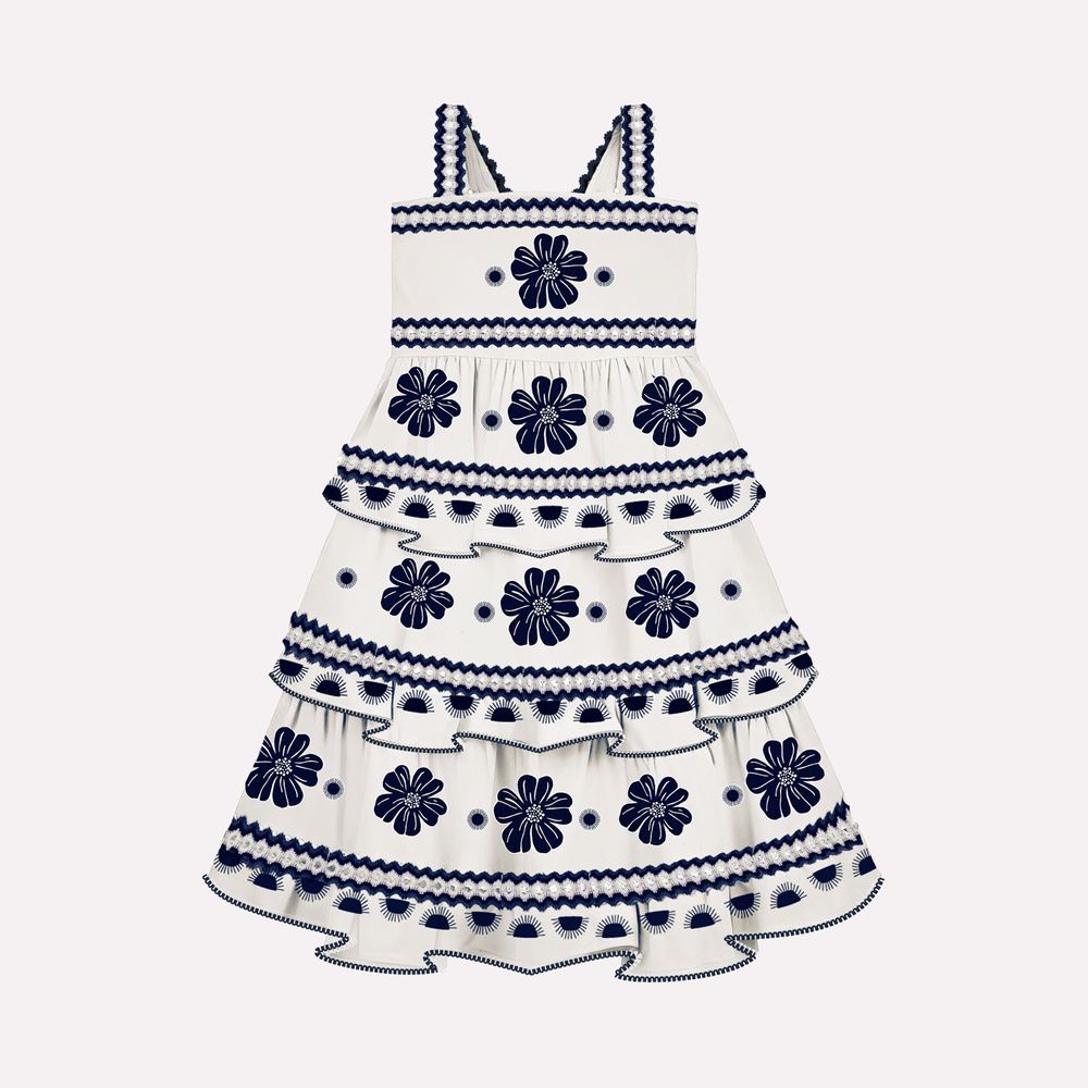 O destaque fica por conta da estampa localizada de flores e dos detalhes em fru-fru aplicados nas faixas, que adicionam textura e um toque artesanal especial. O franzido na cintura valoriza o caimento e proporciona liberdade de movimento, perfeito para dançar, brincar e se divertir com muito estilo! Um vestido que traduz o espírito alegre e sonhador da infância, com o toque delicado e sofisticado da Nanai!