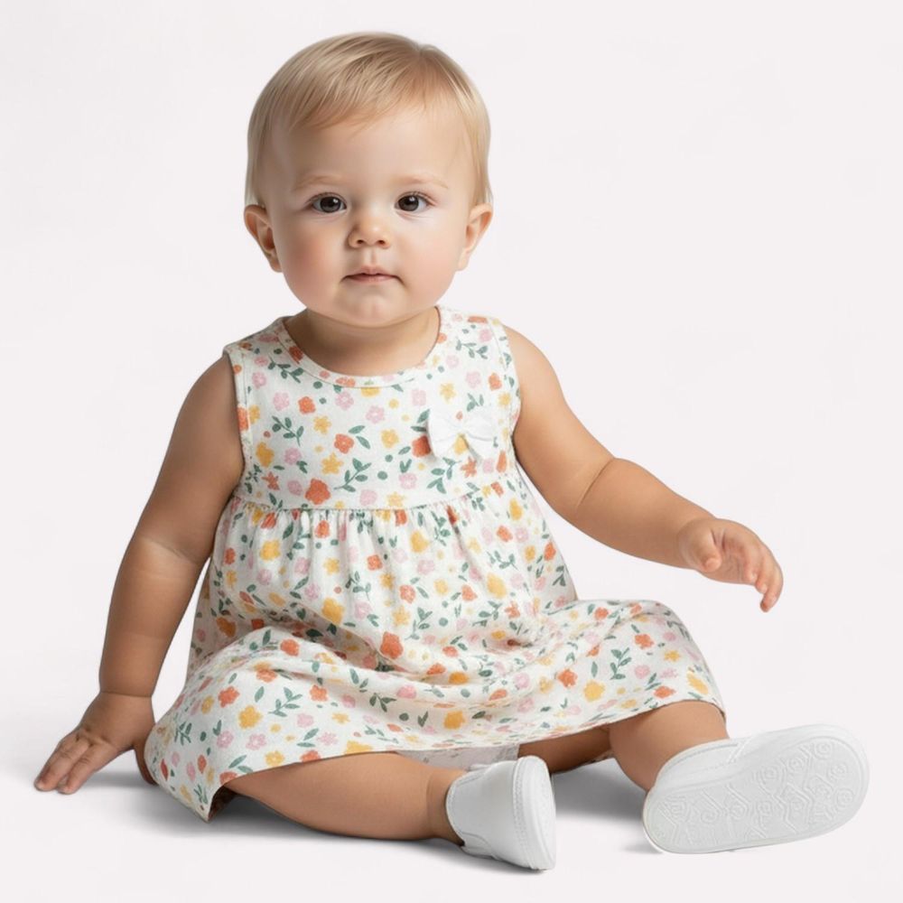 O vestido infantil menina Kyly em meia malha 100% algodão apresenta modelagem superior regata e caimento godê, bem soltinho e com franzidos, ideal para os dias quentes. Sua estampa vibrante cria um visual divertido e cheio de cor com decote arredondado e bainha delicada, garantindo liberdade para brincar e espalhar fofura por onde passar.