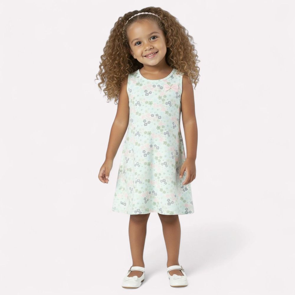 O vestido infantil Kyly é feito em cotton 95% algodão e 5% elastano, garantindo maciez, frescor e caimento impecável. Sua modelagem evasê em estilo regata é prática e leve, perfeita para os dias quentes.