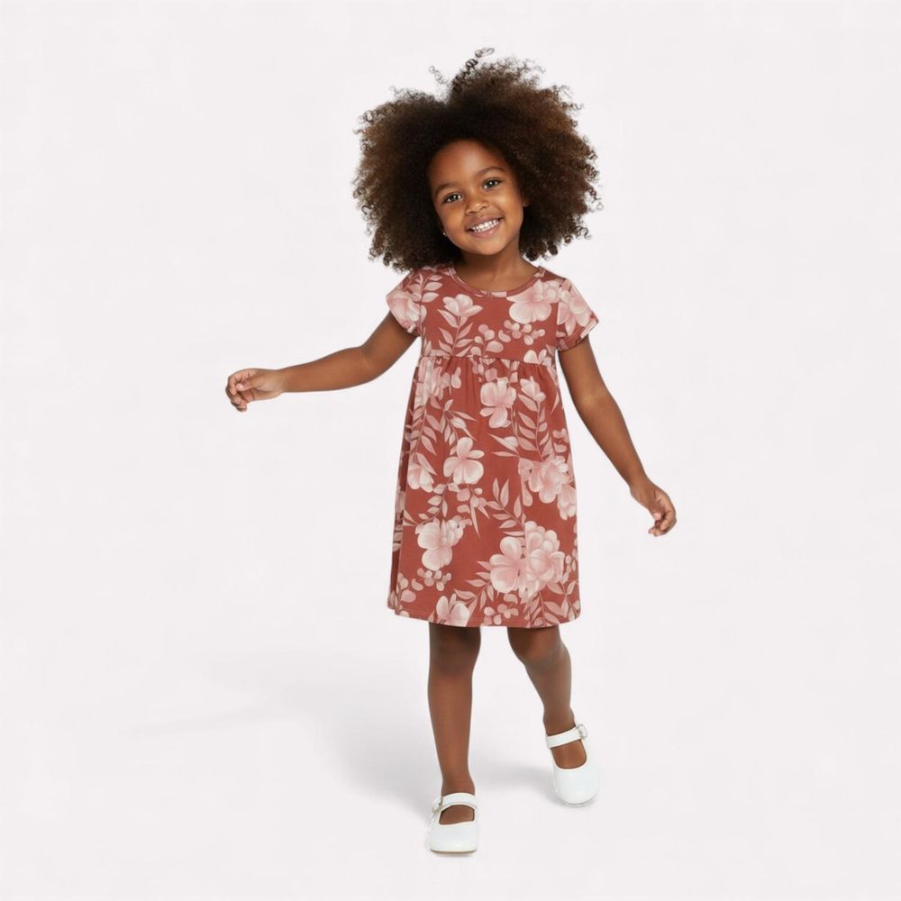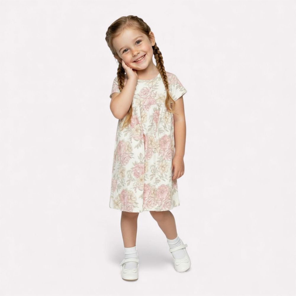Confeccionado em cotton com 95% algodão e 5% elastano, o vestido infantil manga curta oferece maciez, elasticidade e bem-estar para o dia a dia.
